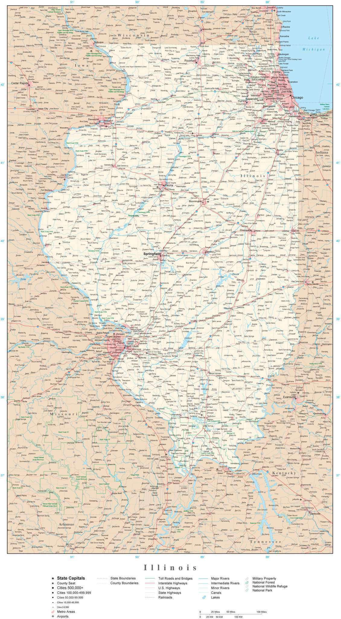 Illinois Detailed Map in Adobe Illustrator vector format. Detailed